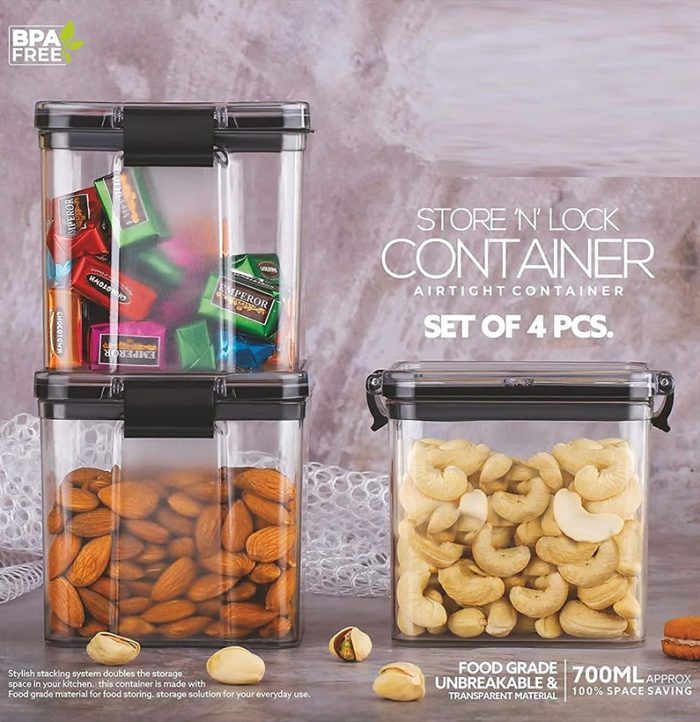 Square shape kitchen storage container set made up from BPA free and food grade plastic material. Set of 4 pcs container comes with leak-proof locking technology. Lock lid comes with silicone which gives your complete air-tight and leak proof experiance.